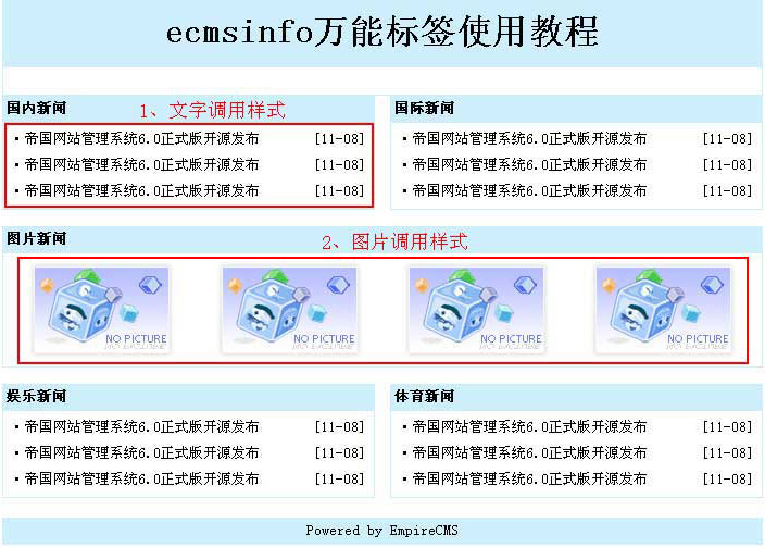 | ecmsinfo標(biāo)簽與其它信息調(diào)用標(biāo)簽唯一不同的是:顯示樣式由標(biāo)簽?zāi)0鍥Q定。 |