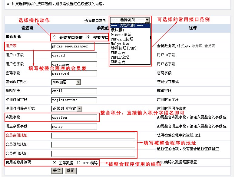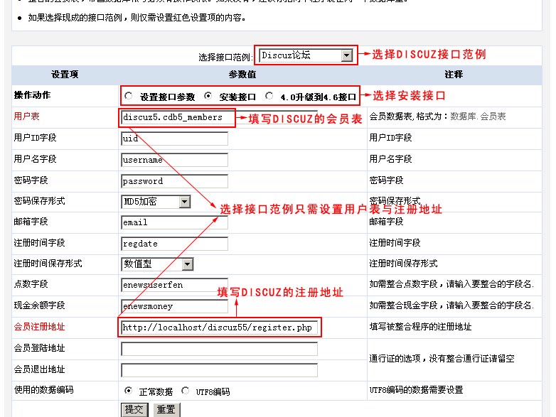 因?yàn)镈ISCUZ有現(xiàn)成范例,所以我們直接選擇接口范例的“Discuz論壇”,選擇后只需設(shè)置用戶表與會(huì)員注冊(cè)地址,然后點(diǎn)擊提交即可。