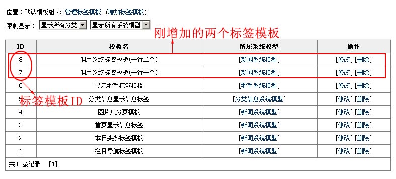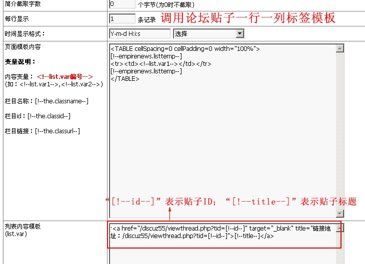 3、制作顯示樣式模板 在標(biāo)簽?zāi)0逯杏?ldquo;[!--title--]”貼子標(biāo)題;“[!--id--]”表示貼子ID。