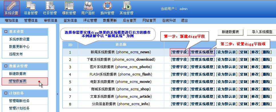 三步教你學(xué)會(huì)digg 操作步驟: 一、 digg字段創(chuàng)建、設(shè)置 登陸后臺--->“系統(tǒng)設(shè)置”--->“管理數(shù)據(jù)表”,進(jìn)入如下圖(圖2):