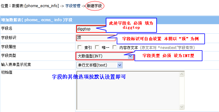 設(shè)置說明:新建的字段名 必須填為diggtop;字段標(biāo)識 可根據(jù)需要自由設(shè)置,本例填為“頂”; 字段類型 選擇大數(shù)值型(INT);字段的其他選項(xiàng)按默認(rèn)設(shè)置提交即可。