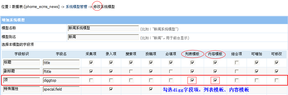 選擇你需要實(shí)現(xiàn)digg效果的系統(tǒng)模型,進(jìn)行右方的操作,本例中以在“新聞系統(tǒng)模型”中實(shí)現(xiàn)digg為例;