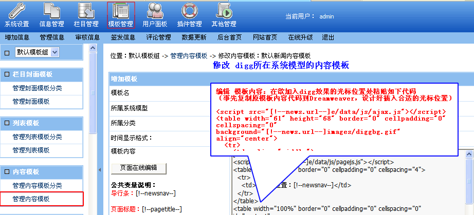 二、 修改digg所在系統(tǒng)模型的內(nèi)容模板 點(diǎn)擊菜單“模板管理” --->“管理內(nèi)容模板” --->點(diǎn)擊右側(cè)digg所在系統(tǒng)模型“修改” (圖5):