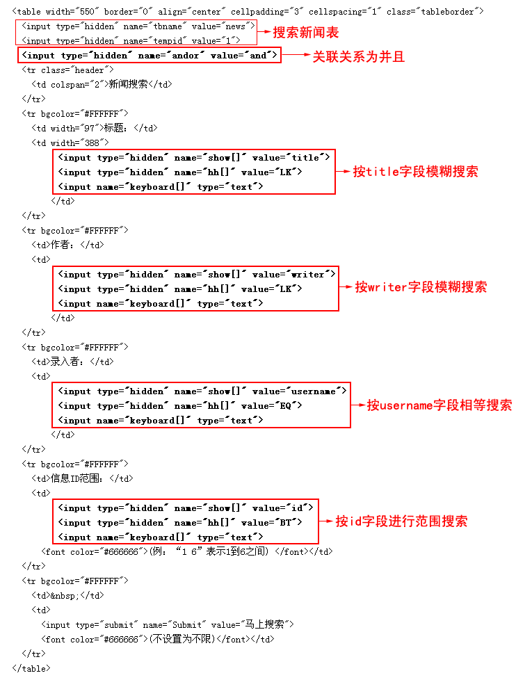 五、支持多字段、多邏輯運算聯(lián)結(jié)符并列搜索 (一)、多字段并列搜索:有“字符串”與“數(shù)組”兩種傳遞方式 1、字符串傳遞為例子: <input type="hidden" name="hh" value="LK"> <input type="hidden" name="show" value="title,writer"> <input type="hidden" name="keyboard" value="標(biāo)題,作者"> (說明:上面為模糊查詢title字段包含“標(biāo)題”字符或者writer字段包含“作者”的信息)