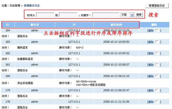 日志記錄是提供對用戶操作進(jìn)行跟蹤及對執(zhí)行疑難排解和監(jiān)控。當(dāng)記錄比較多時候,查詢?nèi)罩撅@得非常重要,需要更快的查找到想知道的記錄。帝國CMS5.1版對日志管理進(jìn)行改進(jìn),查詢?nèi)罩咀兊酶臃奖?,如圖: