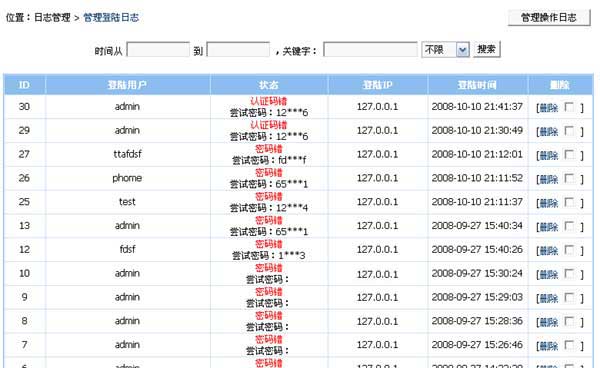 可按操作者跟操作IP進(jìn)行查詢。并且可按各個字段進(jìn)行排序,第一次點擊為降序再點擊為升序。如要查找最近非法登陸的記錄,點擊“狀態(tài)”進(jìn)行排序,最上面顯示的就是登陸錯誤的記錄,可對非法用戶進(jìn)行及時封鎖,非常方便,如圖: