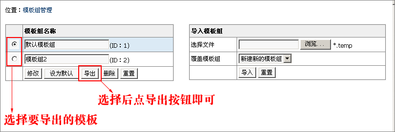 3、進(jìn)入模板組管理界面,選擇要導(dǎo)出的模板,然后點(diǎn)擊導(dǎo)出按鈕即可。如下圖: