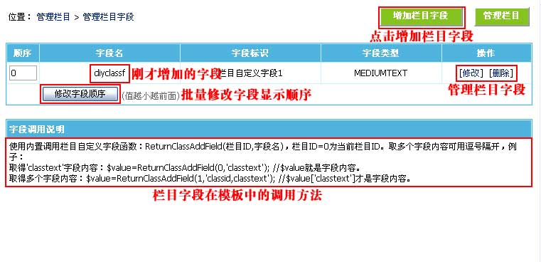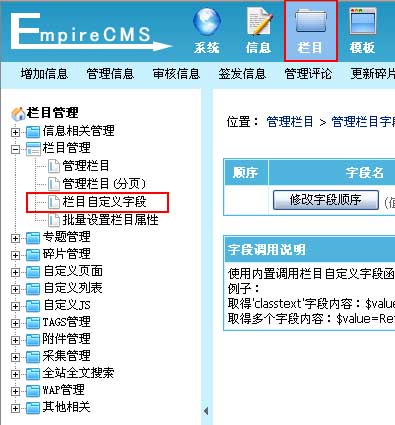 三、欄目字段調(diào)用說明: