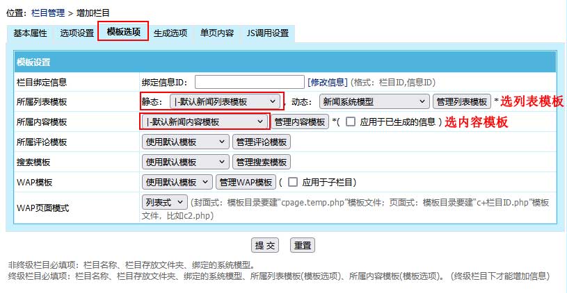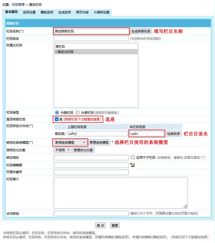 :下面沒有子欄目的欄目,此類型欄目為信息列表頁、綁定信息,終級欄目下方可增加信息。