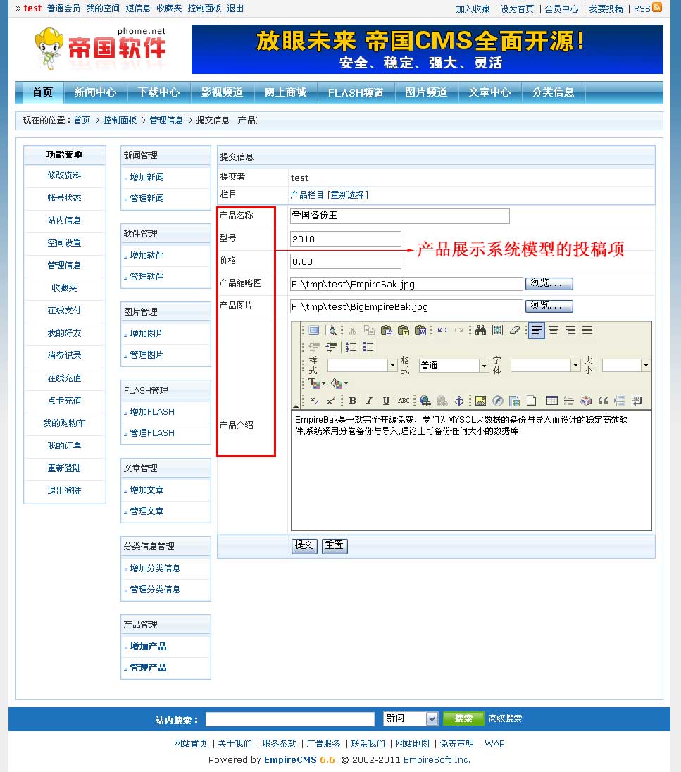 | 通常的產(chǎn)品系統(tǒng)由“產(chǎn)品名稱”、“價格”、“型號”、“產(chǎn)品縮略圖”、“產(chǎn)品圖片”、“產(chǎn)品介紹”等組成。 |