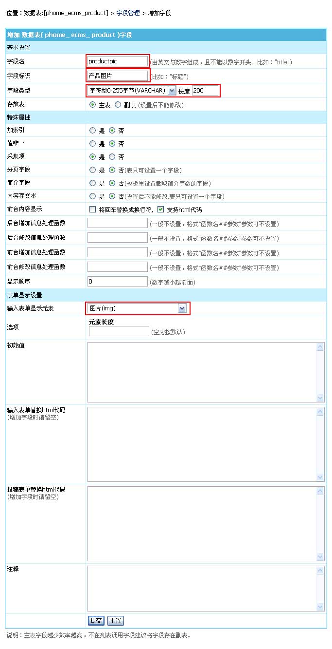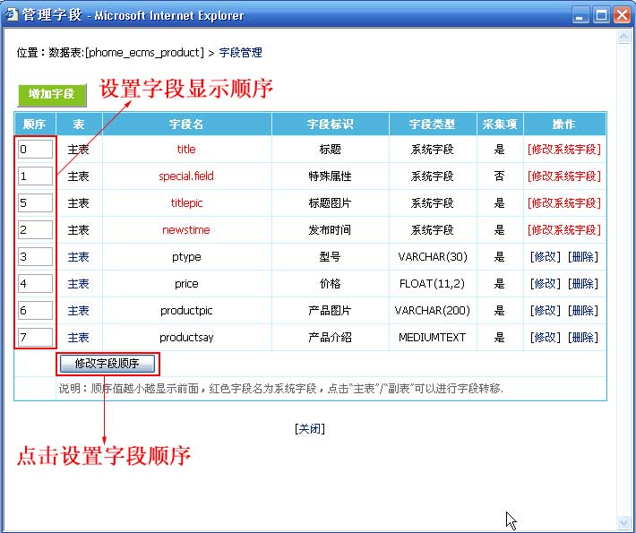 | (三)、增加字段:由于產(chǎn)品名稱與產(chǎn)品縮略圖是系統(tǒng)內(nèi)置字段,所以下面我們增加其余字段。 |