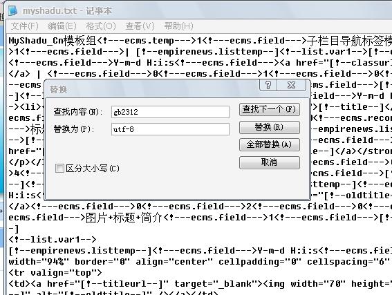 2.使用替換功能,將gb2312 替換成 utf-8 ,替換完另存為UTF-8編碼,再將名字改回*.temp,到帝國(guó)后臺(tái)導(dǎo)入,這個(gè)模板就成了utf8版同時(shí)不會(huì)有亂碼。