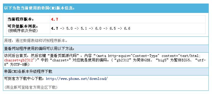 插件介紹:當(dāng)你不知道你備份的數(shù)據(jù)庫(kù)數(shù)據(jù)是什么版本的時(shí)候或者是老版本刪除版權(quán)信息后不知道使用的版本,用此插件可識(shí)別您當(dāng)前數(shù)據(jù)使用的帝國(guó)CMS版本。識(shí)別原理:通過(guò)數(shù)據(jù)表結(jié)構(gòu)來(lái)識(shí)別程序版本。