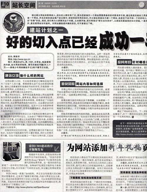 1月5日 《電腦報(bào)》第1期 以標(biāo)題為“帝國(guó)CMS建站程序開源版發(fā)布”對(duì)【帝國(guó)CMS】進(jìn)行了報(bào)道。