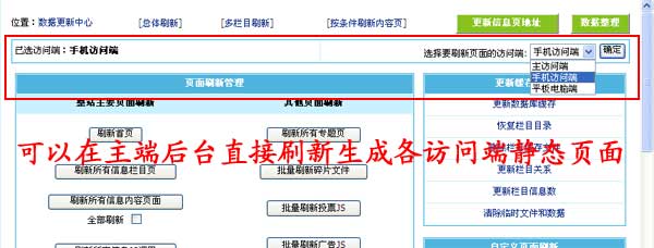 帝國CMS7.5版多訪問端升級:支持在主端后臺刷新生成各訪問端靜態(tài)頁面,多訪問端用靜態(tài)模式下使用更方便。