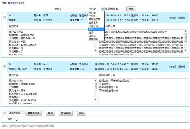 2、支持按會(huì)員副表字段進(jìn)行搜索,比如按 用戶ID、注冊(cè)IP、最后登錄IP、空間名稱、空間公告、手機(jī)、姓名、公司名、聯(lián)系地址 進(jìn)行搜索。