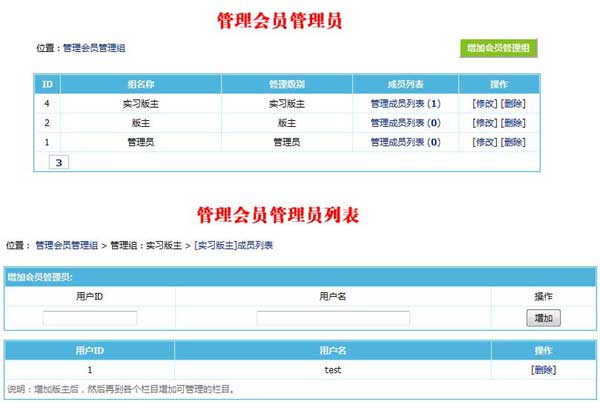 1、默認(rèn)增加管理員與版主兩個(gè)管理組,也可以自行增加管理組、組名稱(chēng)自定義。