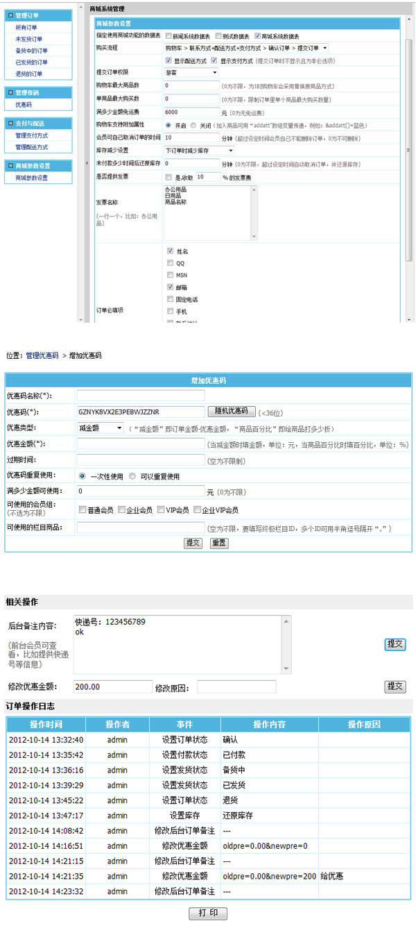 (18)、新增訂單操作日志,對(duì)訂單各操作進(jìn)行記錄,訂單操作過(guò)程一目了然。管理員管理更方便。
