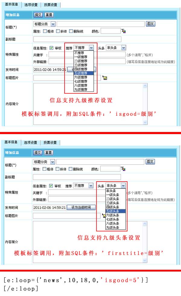 帝國(guó)CMS 6.6版信息支持九級(jí)推薦和九級(jí)頭條,調(diào)用更靈活,更多樣化。后臺(tái)支持設(shè)置多級(jí),前臺(tái)支持按各級(jí)調(diào)用信息。