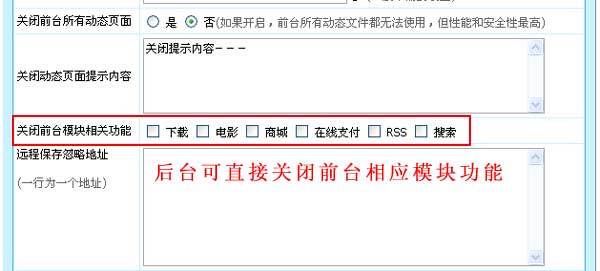 帝國CMS 6.6版新增關(guān)閉前臺相關(guān)模塊總開關(guān),支持下載、電影、商城、在線支付、RSS、搜索模塊關(guān)閉設(shè)置。關(guān)閉模塊更方便,不需要?jiǎng)h除相應(yīng)文件。
