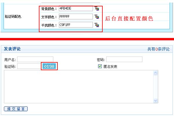 驗(yàn)證碼后臺(tái)可直接設(shè)置“背景顏色”、“文字顏色”、“干擾顏色”,不設(shè)置為使用默認(rèn)。