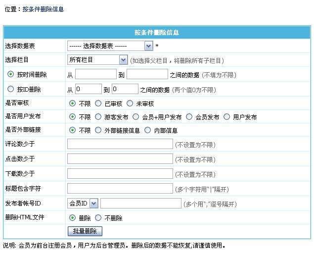 帝國CMS 6.6版批量刪除信息功能增強(qiáng),清除垃圾信息更方便,新增按以下條件刪除信息: