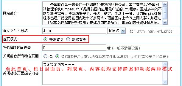 帝國CMS 6.6版首頁和欄目封面頁新增支持動態(tài)、靜態(tài)兩種模式。至此首頁、欄目封面頁、列表頁、內(nèi)容頁均支持靜態(tài)和動態(tài)兩種模式。